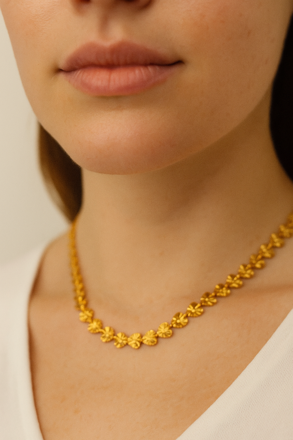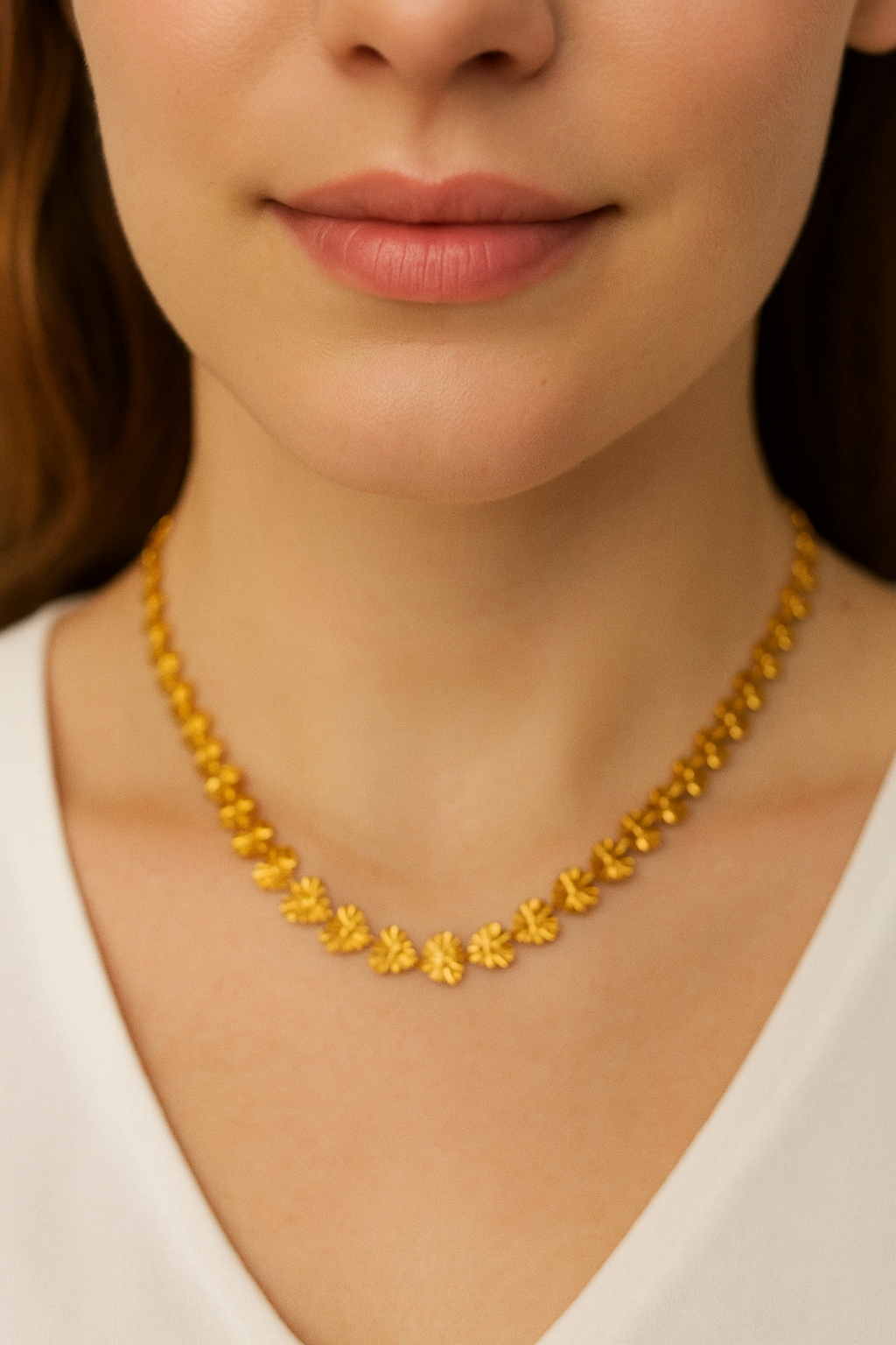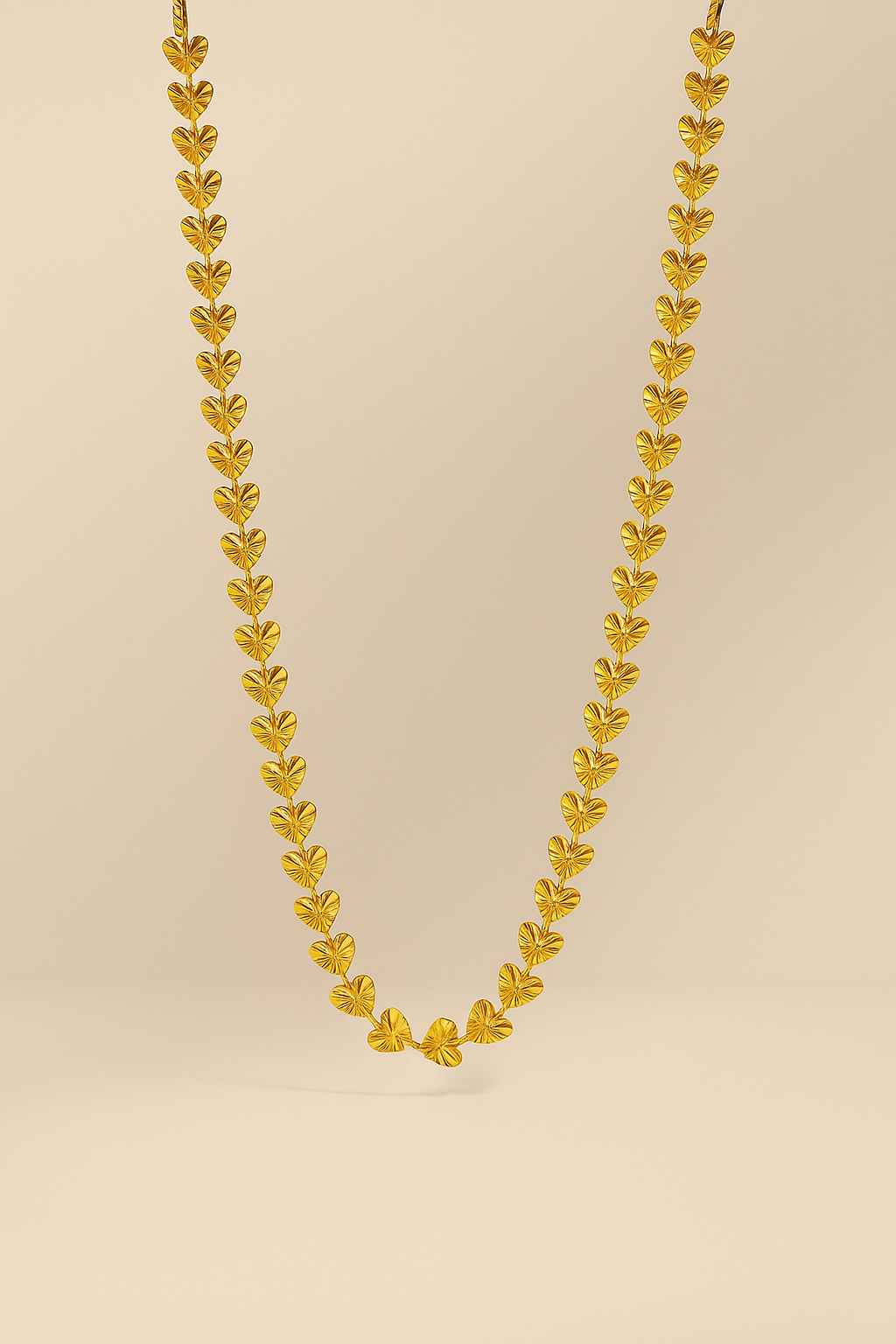 The Nineora LovePetal Heart Chain features a continuous series of delicately embossed golden hearts, each reflecting light like a blooming flower. Placed on a blush silk backdrop, this piece celebrates romance, charm, and womanhood in its purest form. A true luxury statement for those who wear their heart with pride.